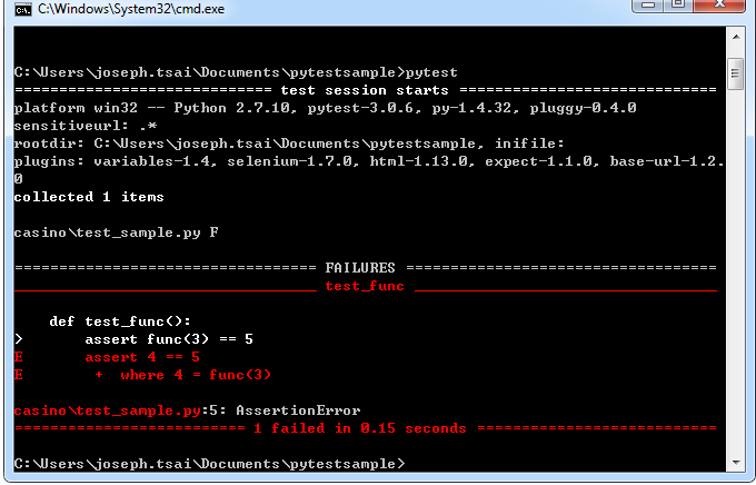 所以我們在根目錄執行就會自動找尋 test_sample.py 裡面的test 開頭的method